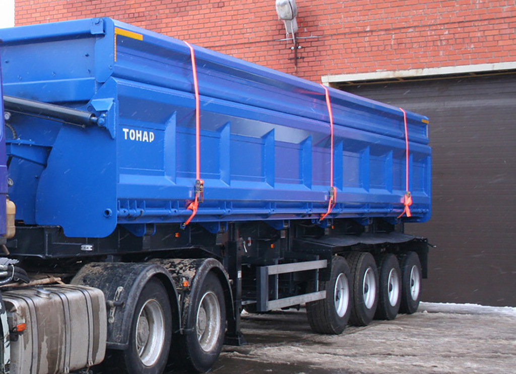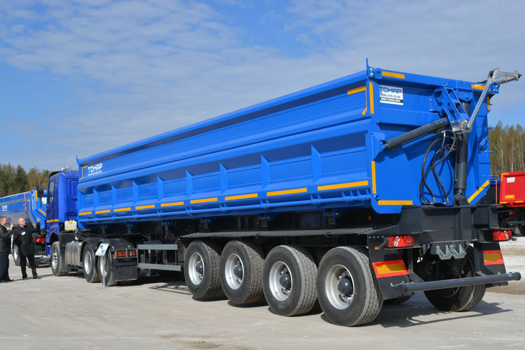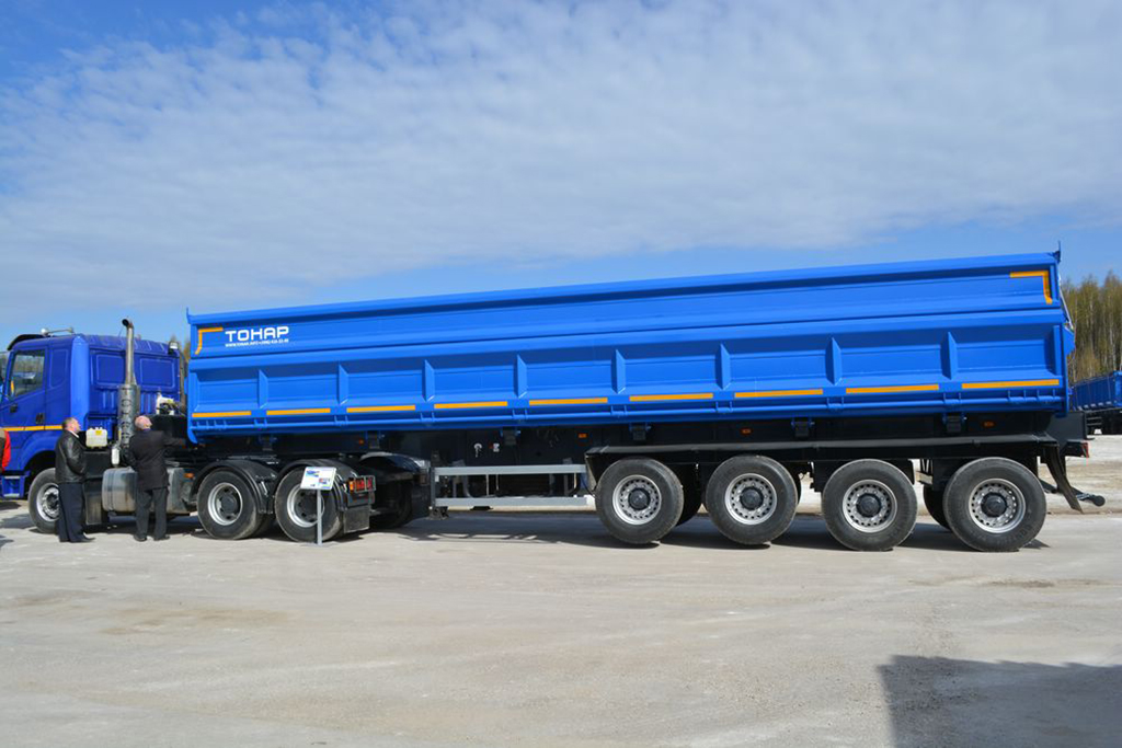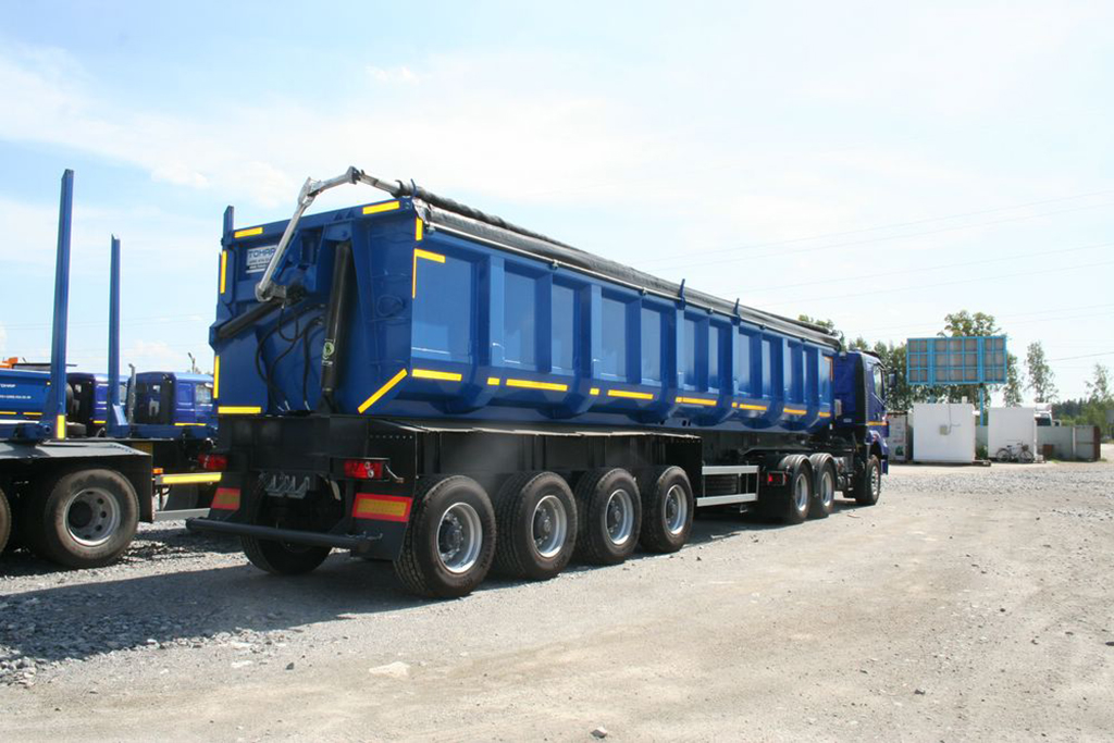 Полуприцеп-самосвал с боковой разгрузкой. Объём кузова 40 куб.м. Разгрузка может происходить в ограниченном по высоте пространстве.
