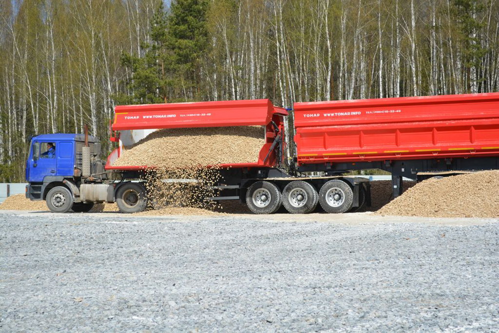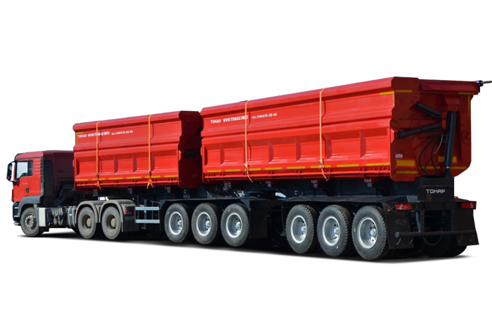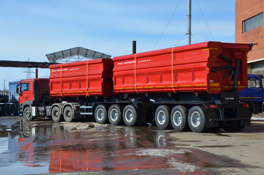 Грузоподъемность до 95700 килограмм, и объем кузова 63,8 кубических метра, усиленную рессорную подвеску, двухконтурное гидрооборудование и шесть осей с двускатной ошиновкой.